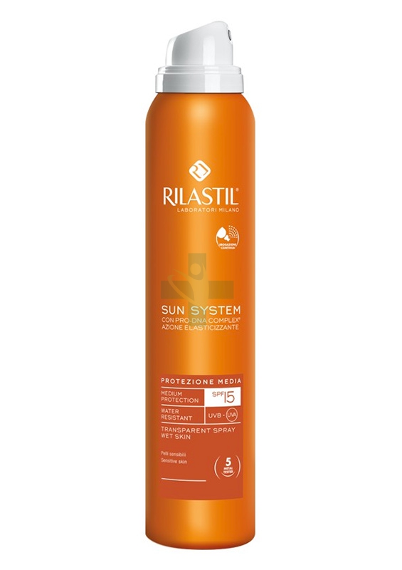 Rilastil Sun System SPF15 emulsione trasparente finemente nebulizzata, indicata per le pelli scure o già abbronzate, anche sensibili. Protezione solare bassa.